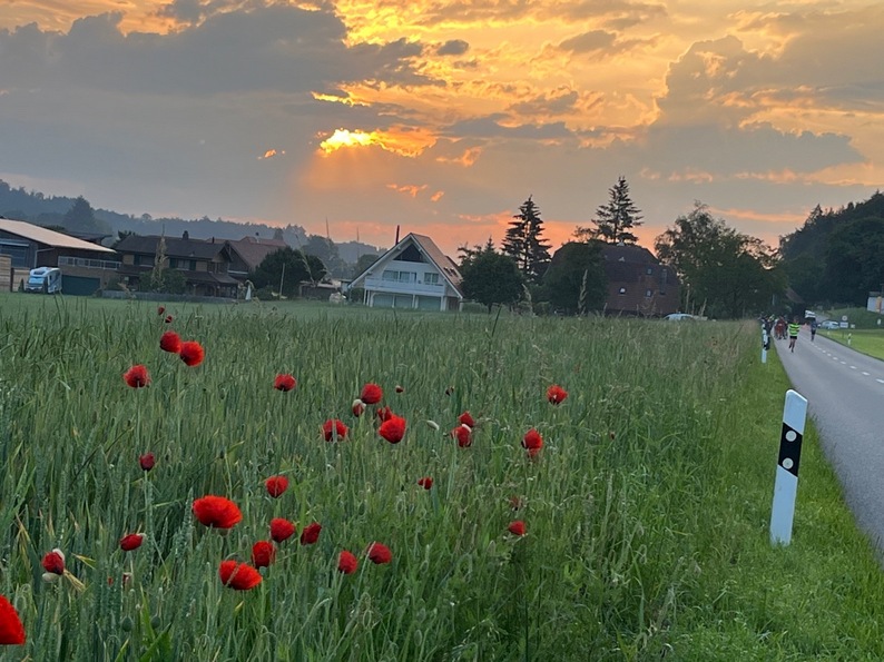 So rannte ich weiter, jetzt wieder großteils auf Asphalt, in eine herrliche Morgenstimmung hinein bei nach wie vor perfektem Laufwetter, da leicht bewölkt. Meine Beine waren auch nach 70 Kilometern noch ok, mental war ich gut drauf und gespannt auf den angekündigten Anstieg. Doch der kam nicht. Die Straße war jetzt meist eine lange Gerade und ging leicht bergauf, aber man konnte gut laufen. Kurz vor Kilometer 80 gegen halb 7 Uhr früh bemerkte ich dann in der Ferne eine größere Menschenmenge an der Strecke. Beim Näherkommen sah ich, dass es eine Wechselzone für die Militärstaffeln war, daher waren um diese Zeit dort schon jede Menge Wartende. Man lief in der Staffelübergabezone eine 90-Grad-Kurve, es gab eine Verpflegungsstelle und – da war er, der nicht mehr erwartete Anstieg! Aber die Straße war nicht allzu steil, ich überlegte noch, ob ich nicht gehen und besser Kraft sparen sollte für die letzten 20 Kilometer. Aber dann dachte ich mir, solange ich den Puls halbwegs niedrig halten kann und der Anstieg nicht zu lang ist, lauf ich. Und es waren tatsächlich nur etwa 500 Meter bergauf, dann ging es wieder flacher dahin und dann etwa vier Kilometer deutlich bergab. Dass es hier noch so gut lief, hat mich zusätzlich beflügelt. Mein neues Ziel war jetzt, unter 11 Stunden zu bleiben. Wenn ich auf den letzten 20 Kilometern einen Schnitt unter 7 min/km schaffen könnte, würde sich das ausgehen. Gegen halb 8 Uhr kam dann doch die Sonne raus und es wurde deutlich wärmer. Andererseits war die Strecke wieder wunderschön, kilometerlang einen Feldweg den Fluss Aare entlang bis nach Büren und dort über die historische Holzbrücke. Die letzten fünf Kilometer biegt man dann in einen schattigen Waldweg, richtig erfrischend und motivierend für den Schlussteil.
