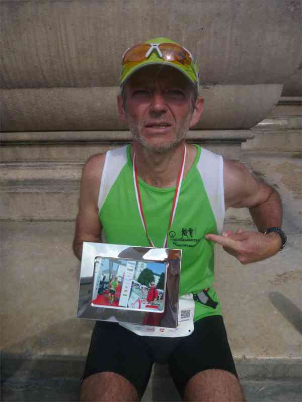 Runter geht es für mich jetzt auch nicht mehr locker. Alles was zu den Beinen gehört, ist schwerstens beleidigt. Ich muss mich voll konzentrieren, um nicht eine Stufe zu übersehen, irgendwo unglücklich aufzutreten und damit einen Krampf auszulösen. Diese verdammte Imbergstiege! Endlich dann doch heil in der Steingasse angelangt. Jetzt ist alles gut. Die letzten Laufschritte trotz allem ein Genuss: Mozart Steg, Mozart Platz, Zielbogen. Sonja und Charly jubeln und fotografieren. Ich habe es geschafft. In einer super Zeit. Beine allerdings absolut tot. Wie schon lange nicht mehr. Gehen? Ein Alptraum. Die Wadenmuskulatur pulsiert selbst beim Stehen im "Erwin"-Modus.