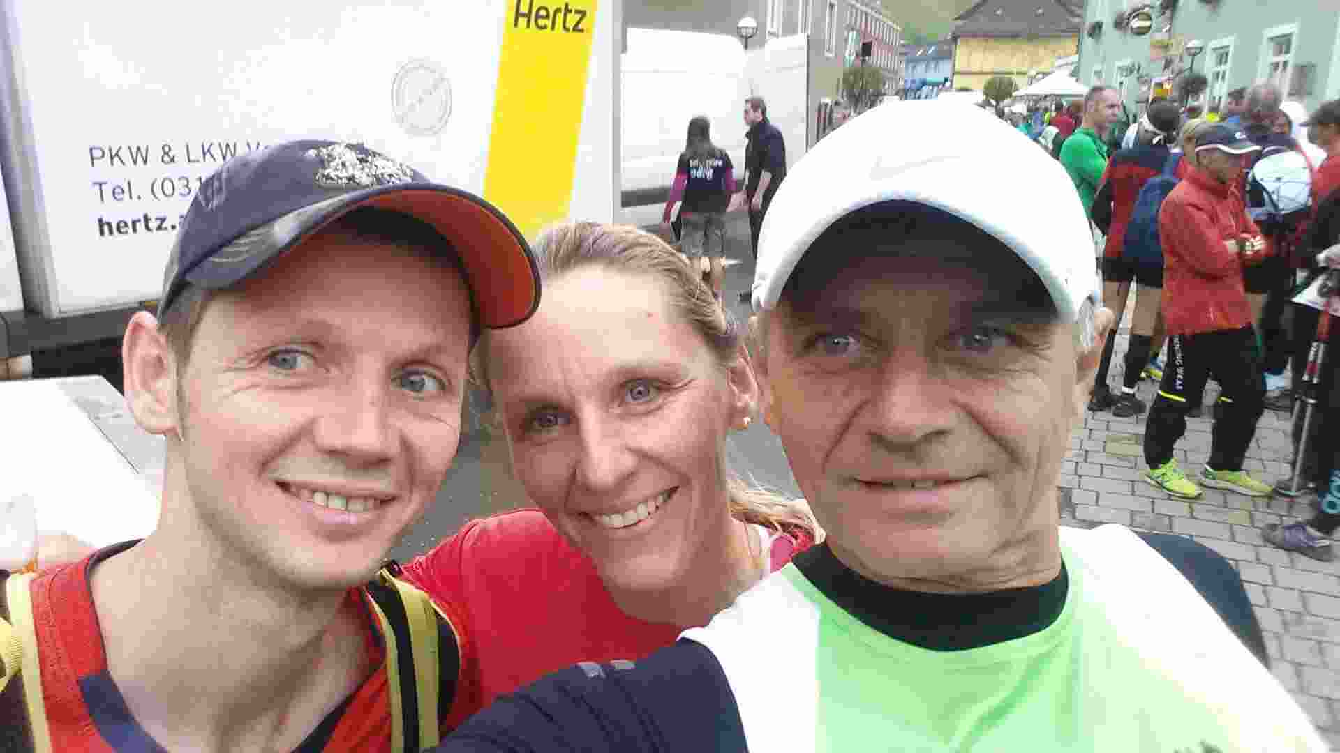 Das Härteste an diesem Lauf: das Aufstehen in Wien am Sonntagmorgen, wenn man zeitig in Eisenerz sein will. Richie hatte den Vorteil, dass er schon in der Steiermark war. Den trafen wir dann gleich in Eisenerz und wir durften nach der Abholung der Unterlagen gleich 1,5h im Wirtshaus verbringen (Richie etwas kürzer, weil die ehrgeizigen Jungspunde sich ja noch 2km einlaufen müssen).