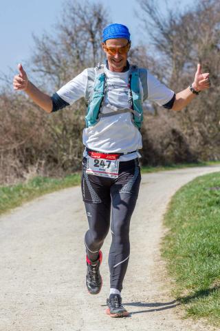 Die 3.Labe - etwas enttäuschend bot nur Wasser (ja ich weiß, es stand auch so in der Ausschreibung, aber wer liest schon so was ). Über die Straße (gut gesichert per Polizei, super!) und weiter hügelig durch den Wald. Kurz vor dem Haidlhof wurde es dann noch gatschig, aber nicht so schlimm…. Bei der 4.Labe direkt beim Haidlhof gab es neben Isogetränken auch Cola ! … gut gestärkt ging es auf den letzten Streckenabschnitt: die etwas langweilige Strecke am Radweg die Straße entlang - weit vor mir die Läufer wie auf einer Perlschnur aufgereiht gegen den Wind. Ich schlug ein mir angenehmes Tempo an und lief los. Bald hatte ich die Läufer vor mir erreicht und überholte, ohne es geplant zu haben, einen nach dem anderen. Die erstaunten Blicke einiger junger Burschen, als sie von mir überholt wurden, waren köstlich. Ganz offensichtlich machen sich Ultraläufe doch bezahlt da ist man gewohnt, das Tempo auch auf längeren Strecken zu halten … dann noch einmal ein gut abgesicherter Straßenübergang und ab durch die Weinberge.